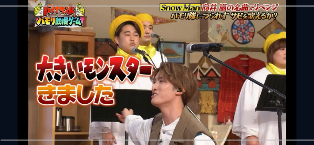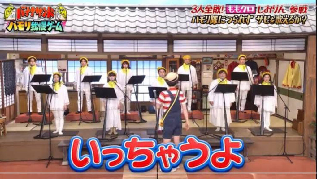 ハモリ我慢ゲームでは、出演者が真剣に歌を披露する中で、周囲のメンバーがわざと笑わせようと妨害してくるという、シンプルな企画。