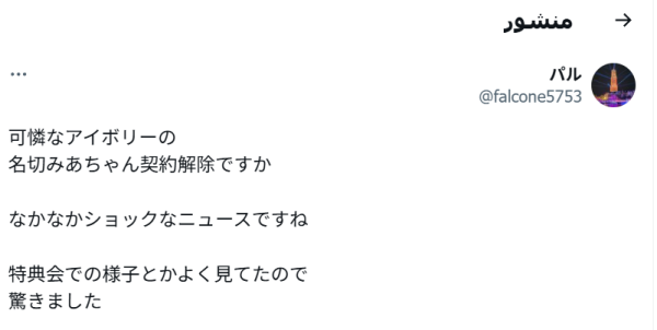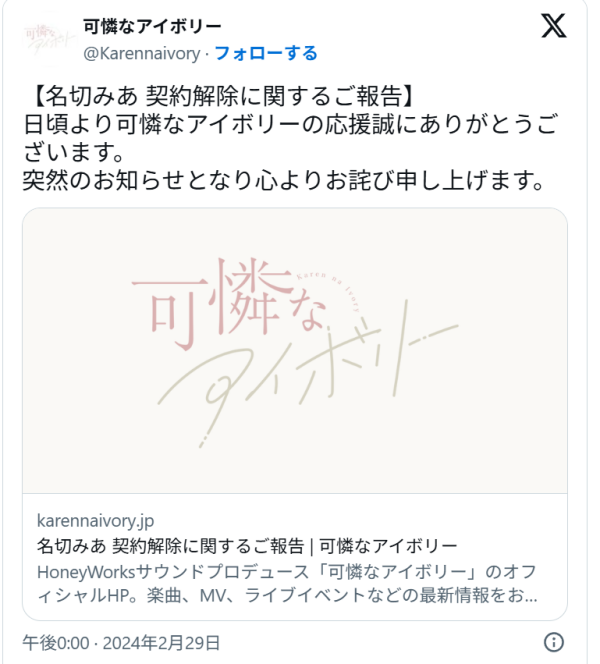この度、可憐なアイボリーの名切みあに関しまして、重大な契約違反行為が発覚し、本人と話し合った結果、本日付けでグループを脱退し契約解除となりましたことをご報告いたします。