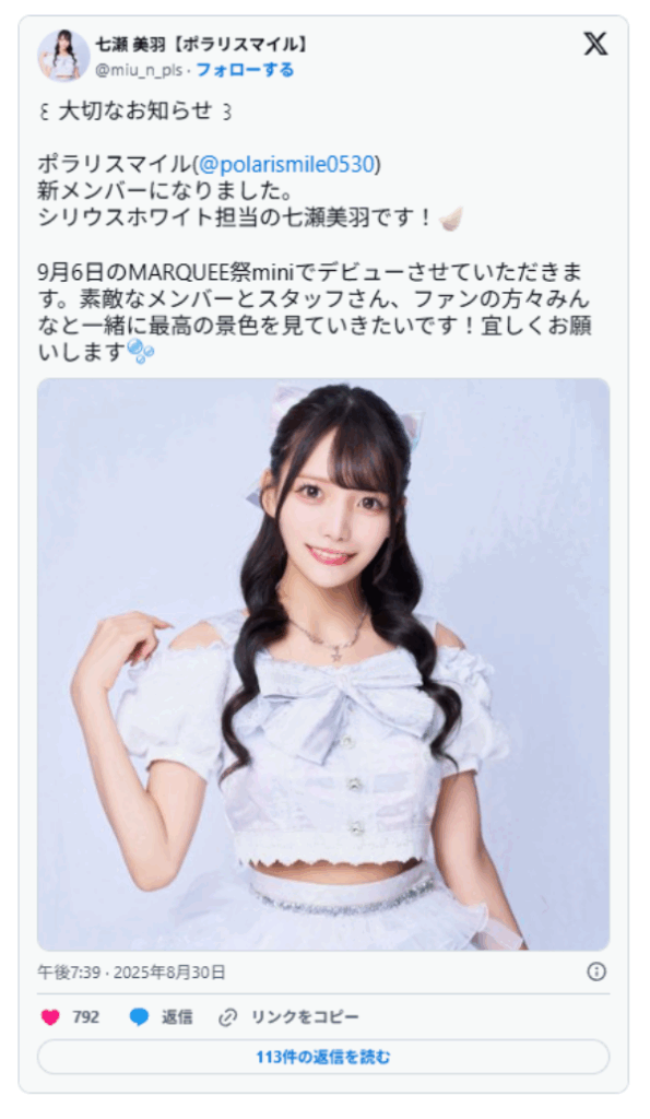 そしてその後、2025年8月30日に「七瀬美羽」としてアイドルグループ「ポラリスマイル」に所属することを公にしました。