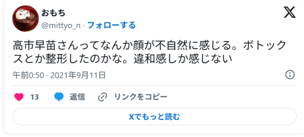 高市早苗さんの顔に関しては、この投稿のように整形を疑う声も根強くあります。